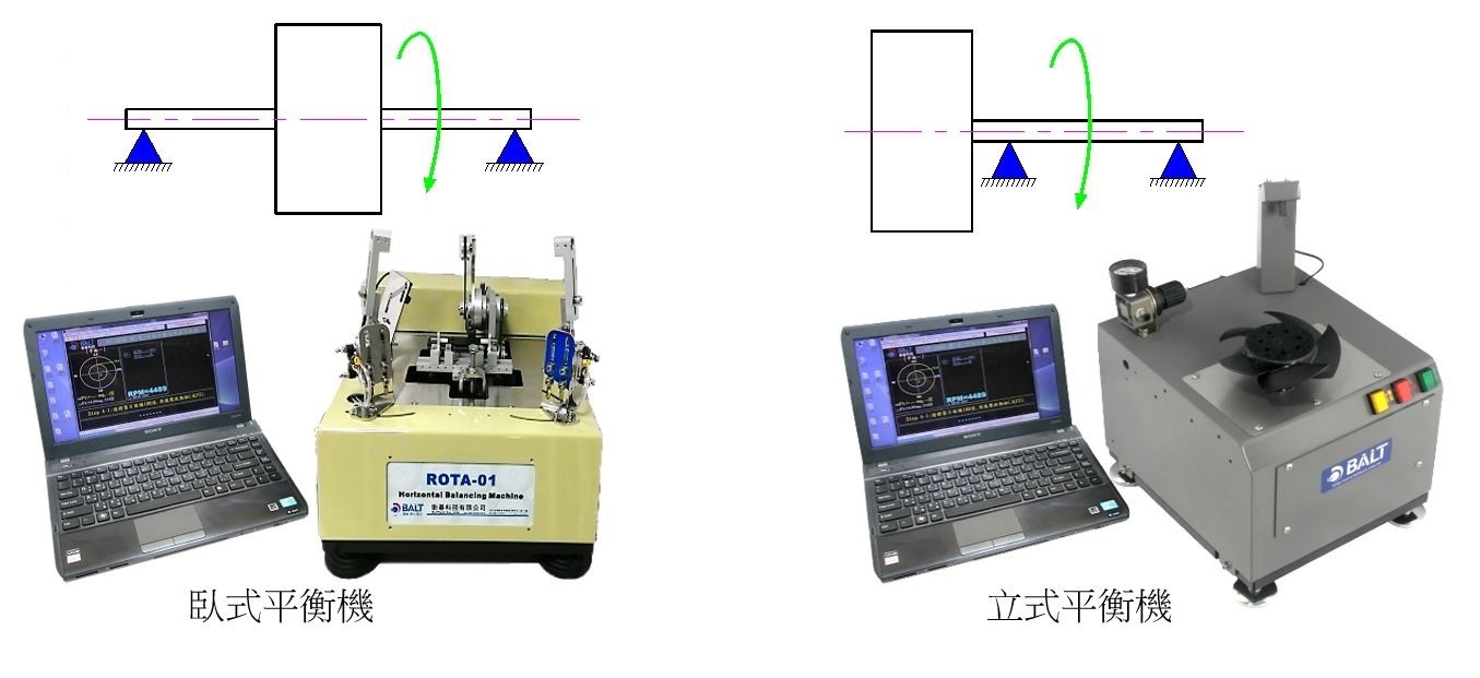 - 從平衡機量測原理來分類的有硬支撐及軟支撐平衡機,硬支撐平衡機測量轉速應用於其系統的固有頻率之下,較常用來平衡量測尺寸及重量較大型的轉子;軟支撐平衡機測量轉速應用於其系統的固有頻率之上,較常用來量測平衡尺寸及重量較小型的工件。