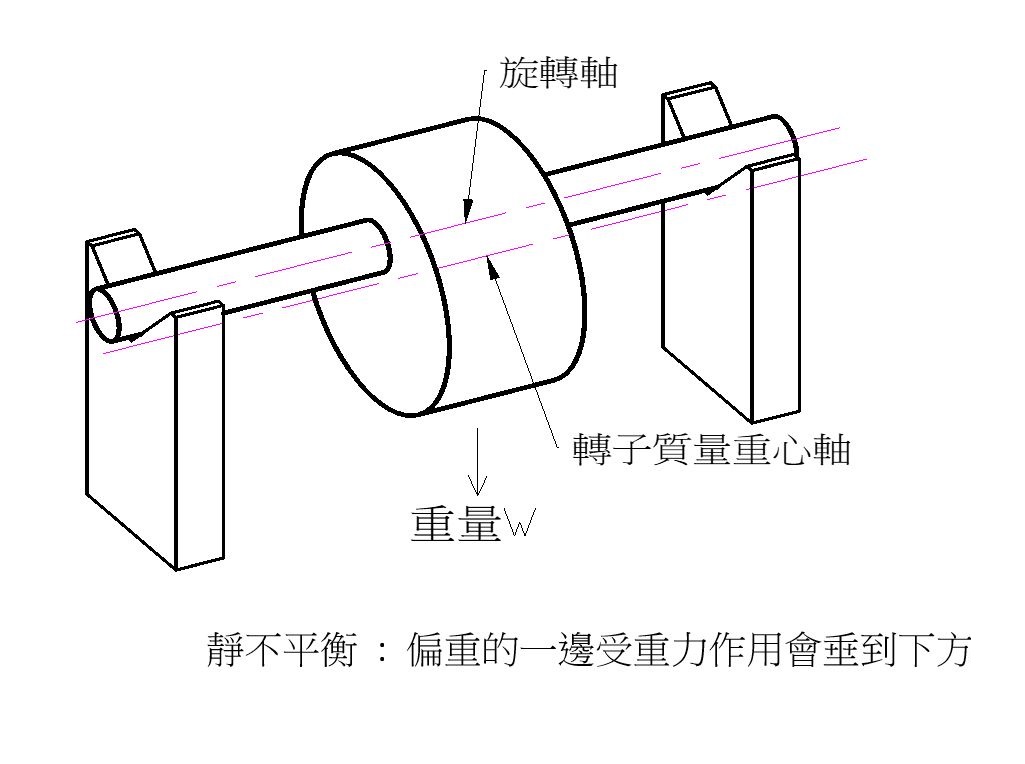 過去我們常見的平衡工藝,將旋轉體置於靜止狀態中就可進行的平衡,偏重的一邊受重力作用會垂到下方,進行平衡校正。此平衡工藝稱為靜不平衡校正。