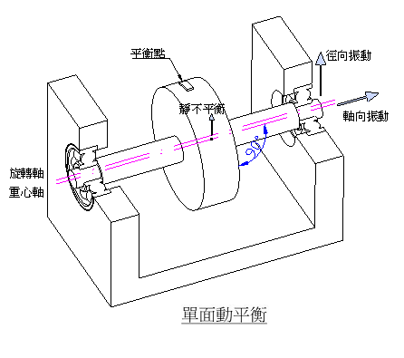 - 單面平衡: 一般轉子高度較薄與旋轉軸垂直度幾近90度,偶不平衡很小時,選用單面動平衡不平衡型態為靜不平衡,使用單面動平衡校正。