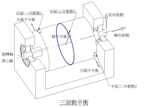- 三面動平衡:一般用來分析轉子靜不平衡與偶不平衡的問題(轉子與旋轉軸之間同心度、垂直度),而第三面動不平衡直接影響轉子靜不平衡(振動影響徑向振動),無法解決偶不平衡問題(無法解決軸向振動)。