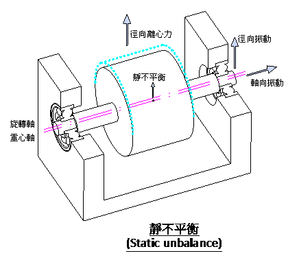 - 靜不平衡(static unbalance):靜不平衡為重心軸與旋轉軸平行不重疊下產生,離心力運動的方向為垂直於旋轉軸平面,靜止狀態中就可進行的平衡,偏重的一邊受重力作用會垂到下方,進行單平面的平衡校正。
