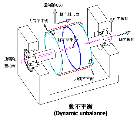 - 動不平衡(dynamic unbalance):動不平衡就是靜不平衡與偶不平衡的混和,其不平衡量為兩個大小不相同、無固定方向,此種不平衡無法於靜止狀態下進行平衡,需藉由儀器或平衡機,轉動後經由力學的原理量測出不平衡量大小及位置,進行兩個平面或三個平面的平衡校正。