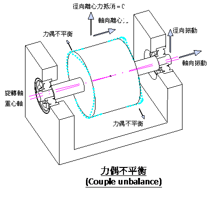 - 力偶不平衡(couple unbalance):力偶不平衡為旋轉軸通過重心軸中心並交錯下產生,離心力運動的方向為平行於旋轉軸的方向,其不平衡量為兩個大小相同、方向相反。此種不平衡無法於靜止狀態下進行平衡校正,需藉由儀器或平衡機,轉動後經由力學的原理量測出不平衡量大小及位置,進行兩個平面的平衡校正。