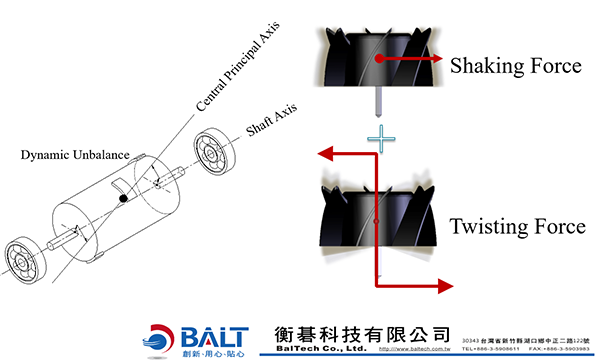 - 動不平衡 (Dynamic Unbalance ) : 兩軸線平行並交錯偏離,造成旋轉體轉動不穩定的不平衡質量稱為「動不平衡 =靜不平衡 + 偶不平衡」(Dynamic Unbalance = Static Unbalance + Couple Unbalance),旋轉體旋轉時沿著軸向及徑向的方向不穩定的擺動;對軸承軸向及徑向產生壓力。此種型態無法靜態中實施平衡校正,必須使轉子轉動利用動力學原理,讓不平衡產生離心力,計算出不平衡的大小及位置。