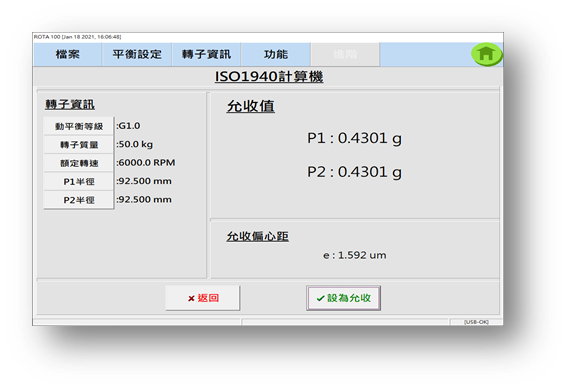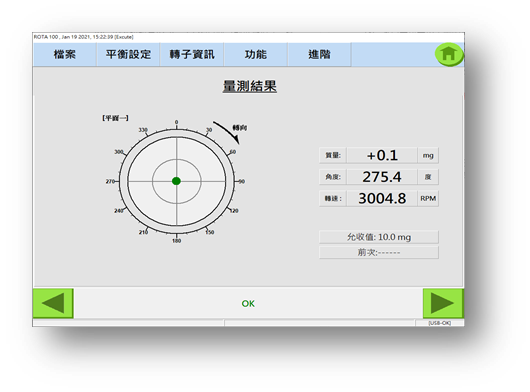 | 平衡機規格 | > 動平衡量測: 單面平衡機 > URR > 92% > Umar (g ⋅ mm/kg) < 0.8 um > 測量方式 : 立式平衡機 > 轉速範圍 : 300 - 1,500 RPM |