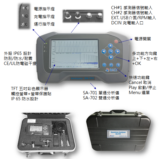 | 游標功能 | 峰值/RPM/手動 | 振動分析功能 | Orbit plot(僅支援SA702 /SA704) | ||